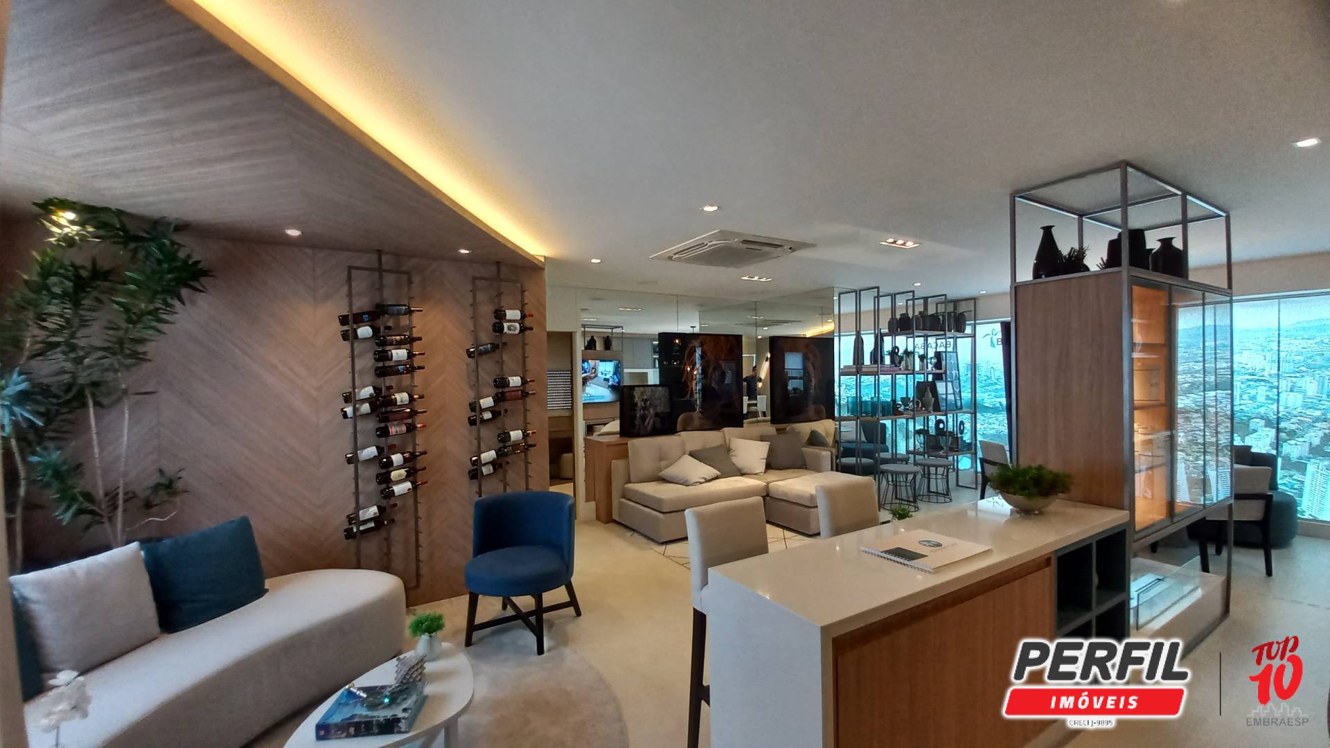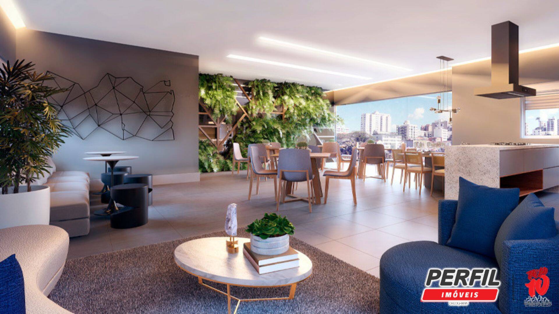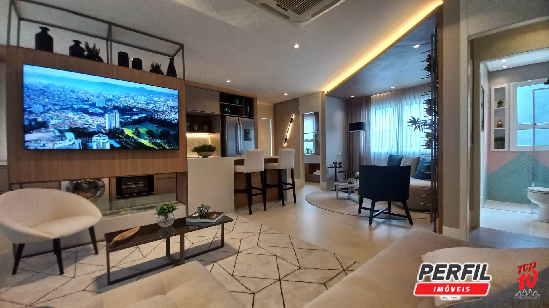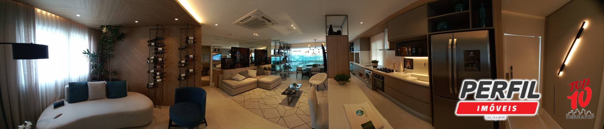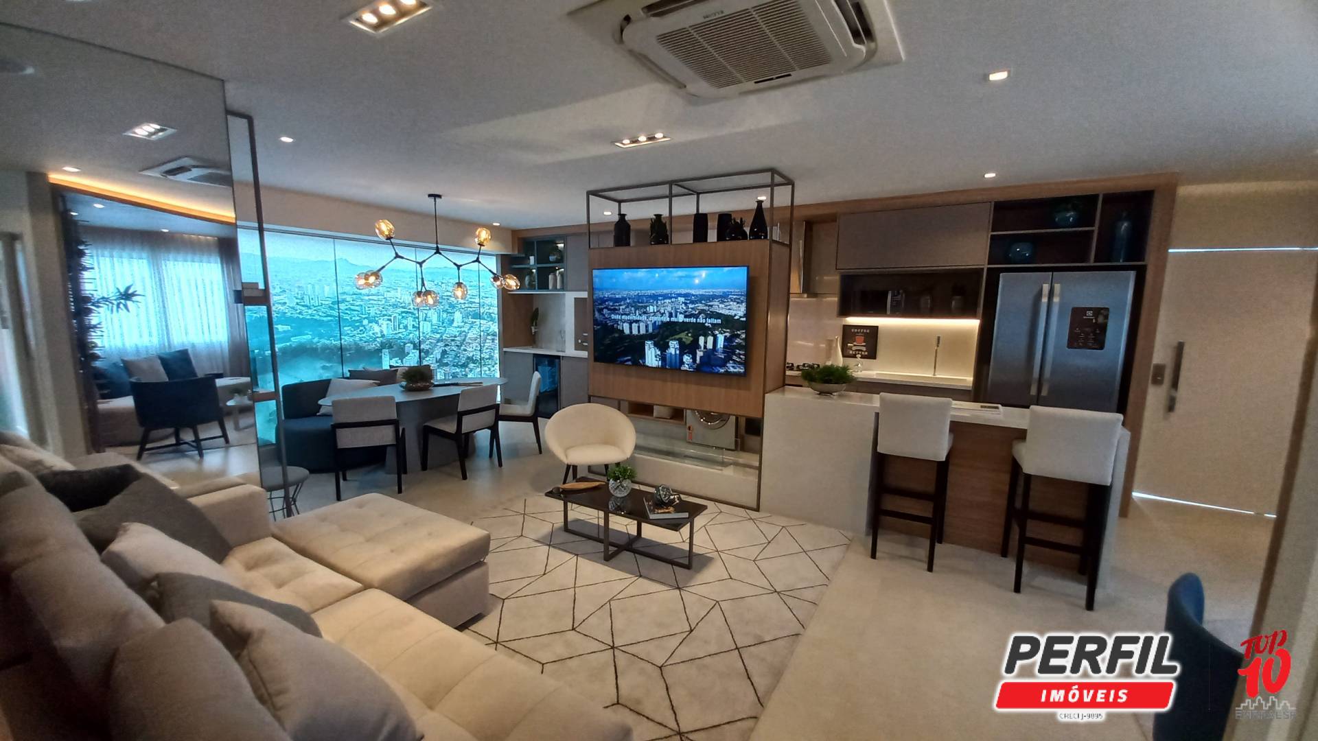 • Sala ampla integrada à varanda gourmet com churrasqueira a carvão