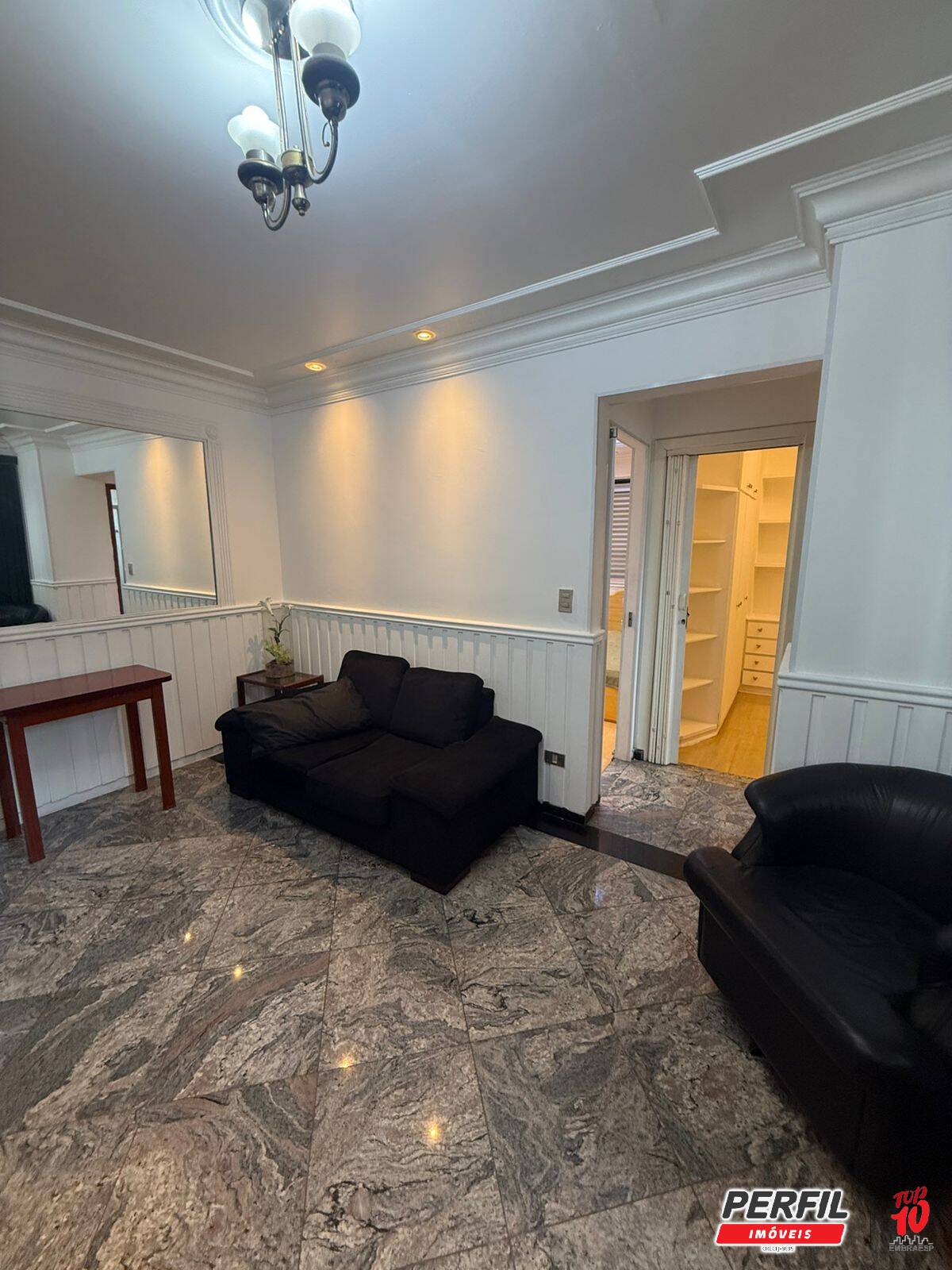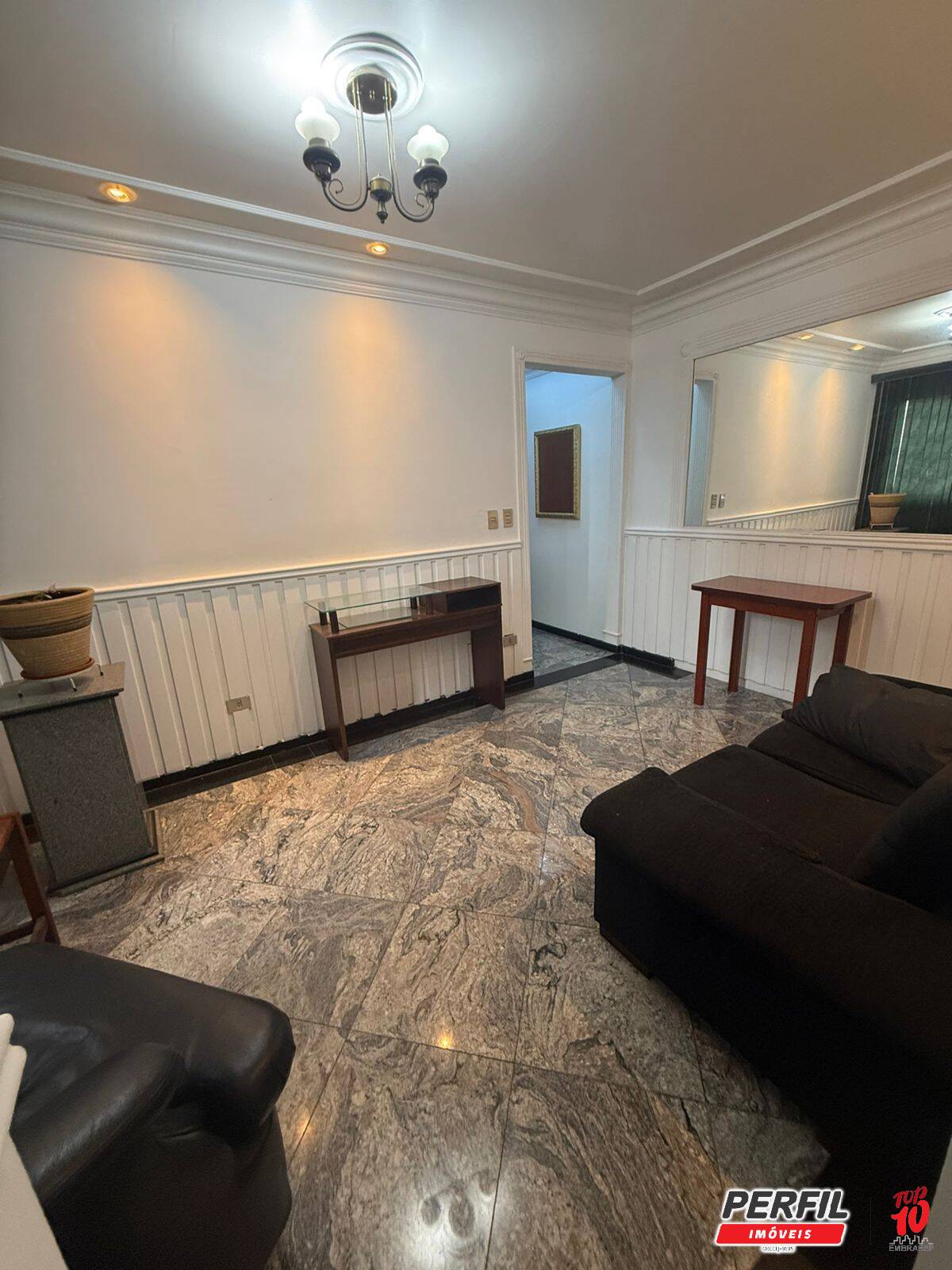 -sala com piso em granito, com sofá e persiana;