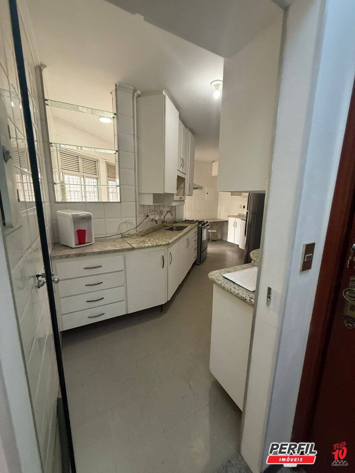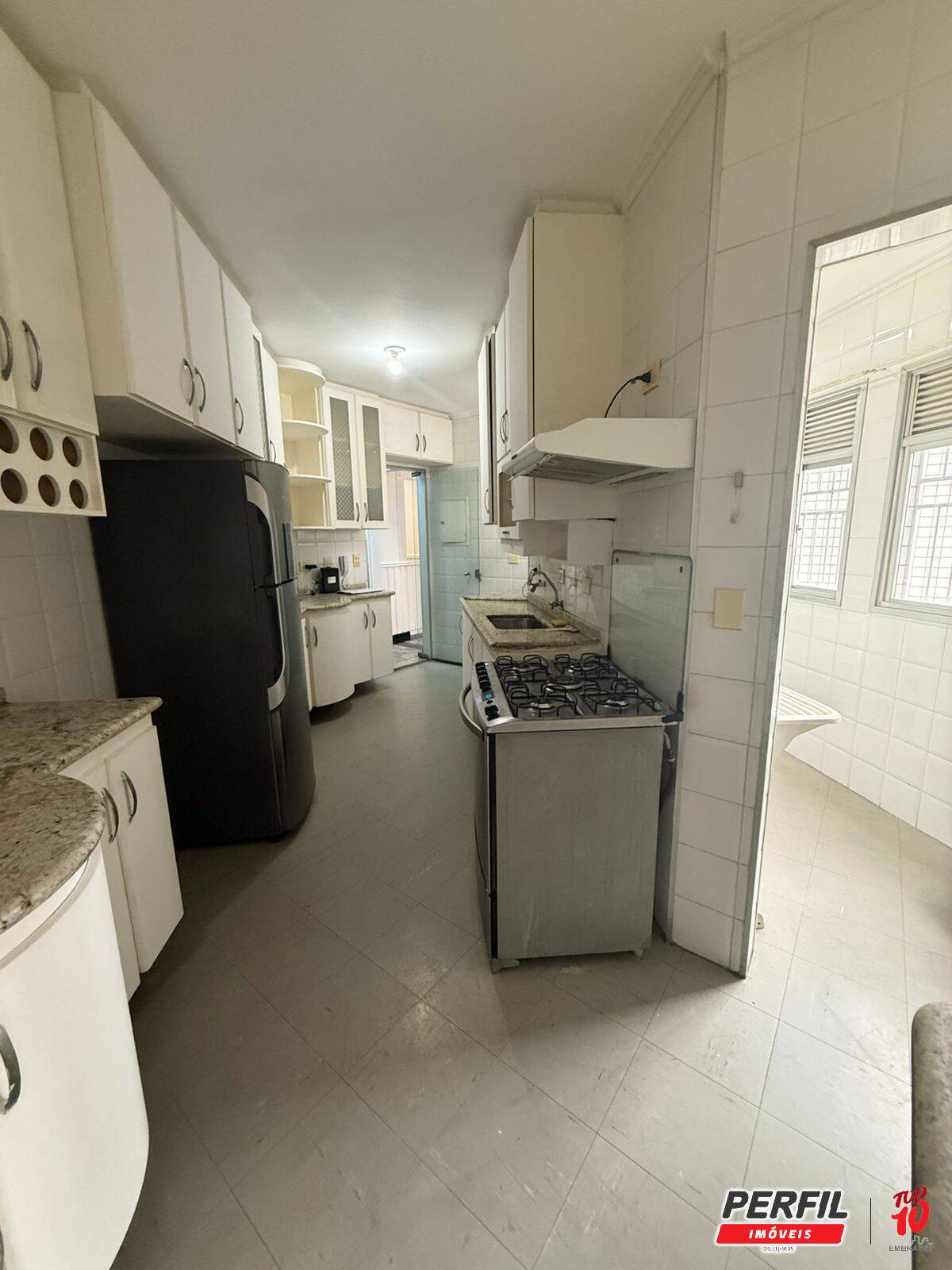 -cozinha repleta de armários, fogão, geladeira, filtro de água, micro-ondas e mesa em granito;