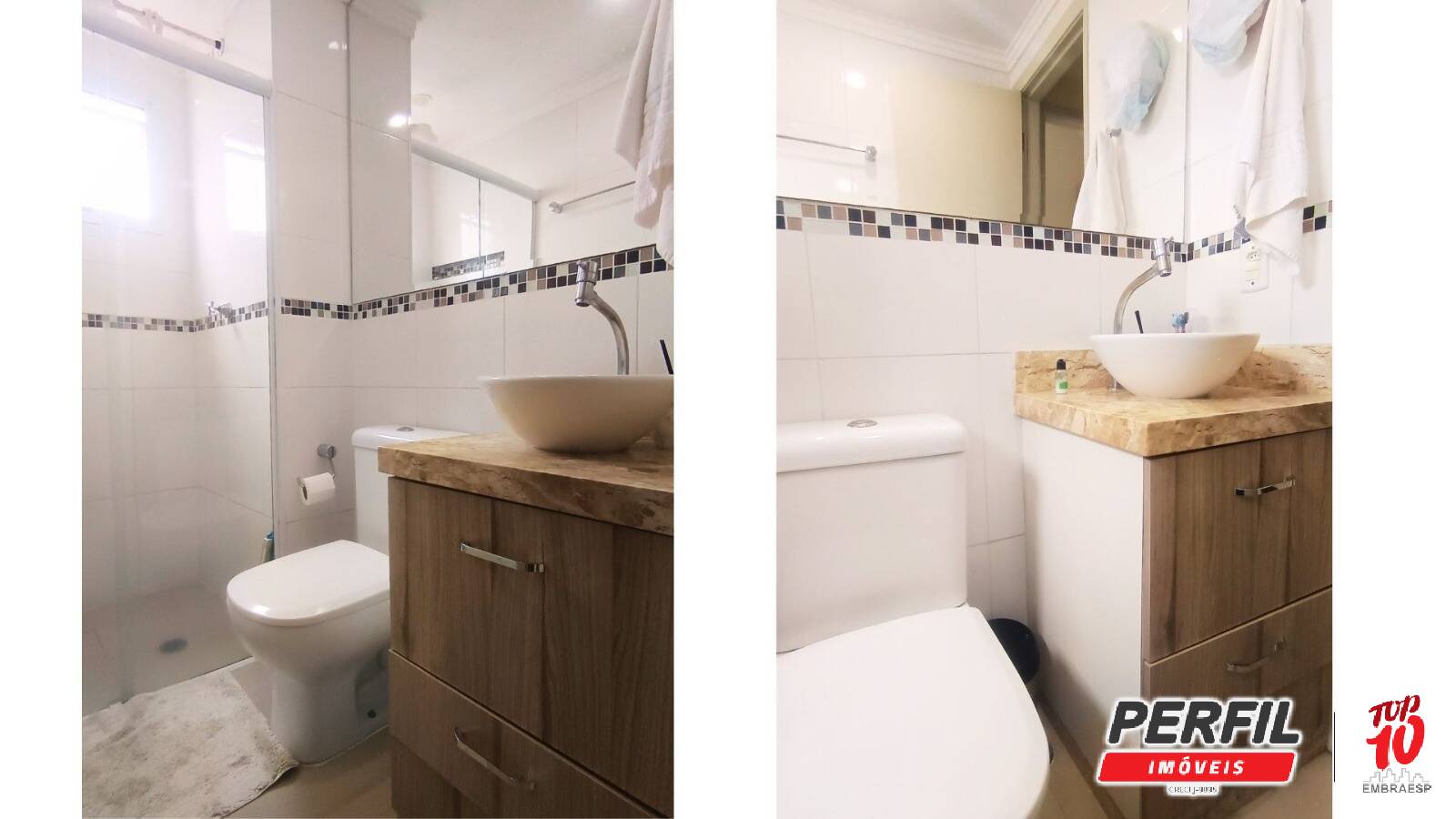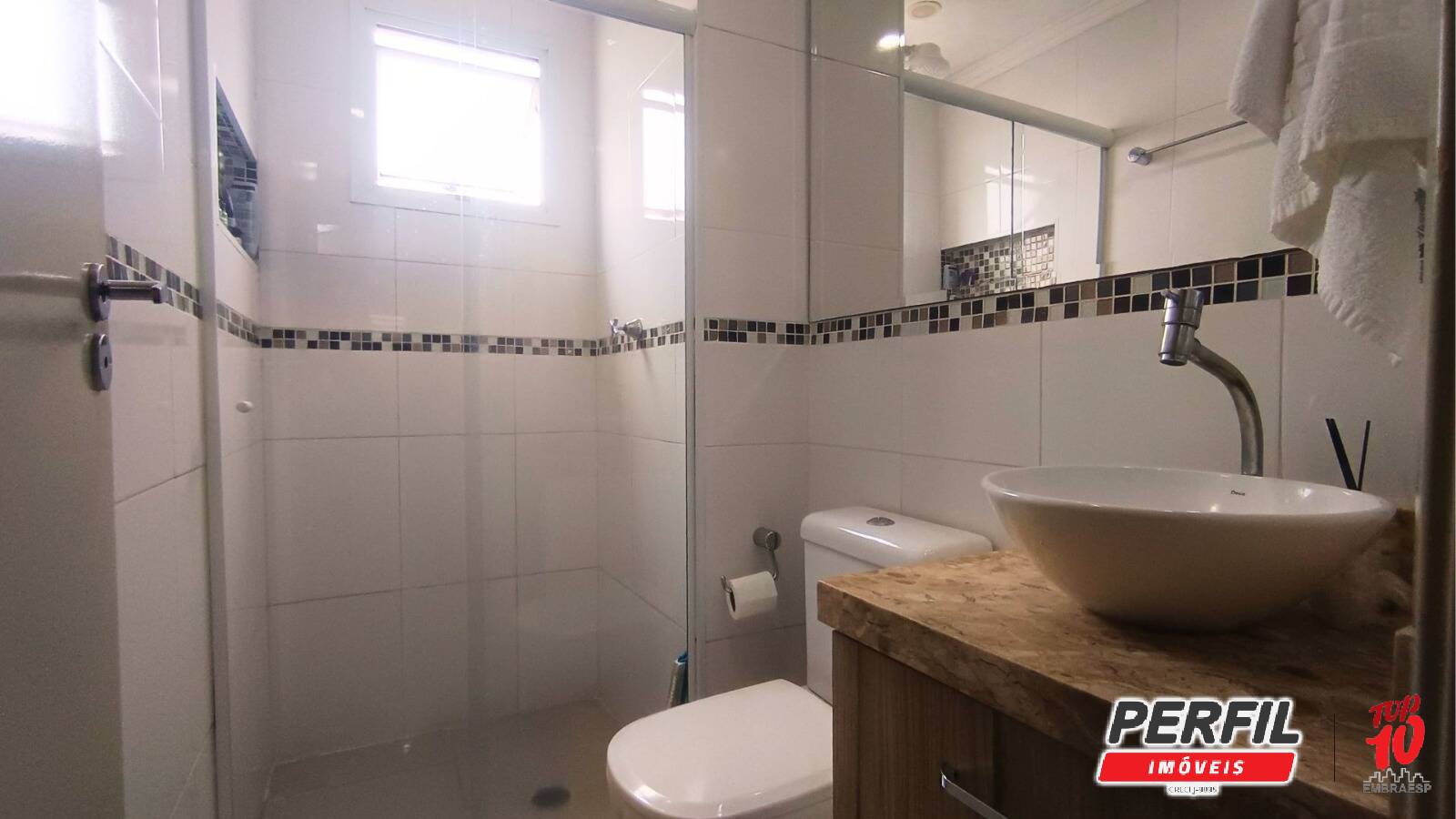 - Banheiro moderno, com armário planejado e box;